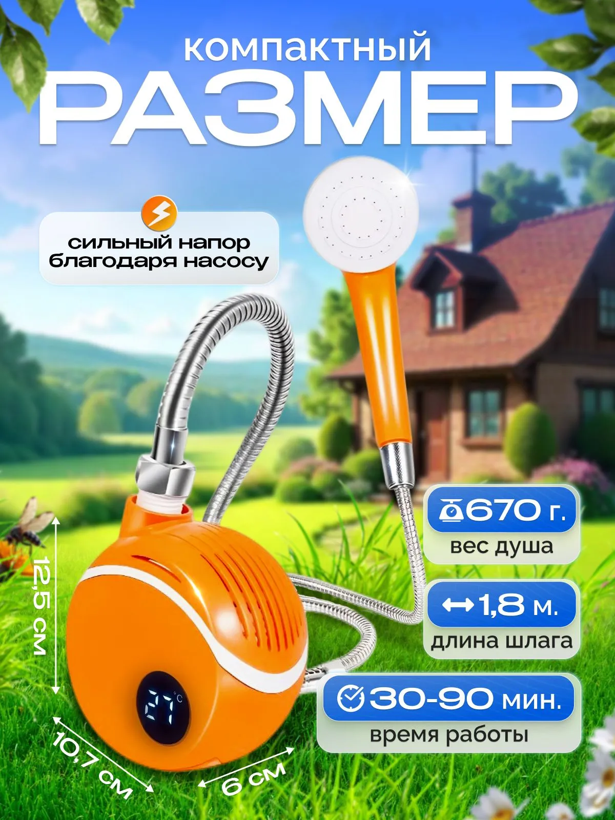 Душ портативний кемпінговий акумуляторний 2000 мА цифровий дисплей датчик температури, літній душ для дачі