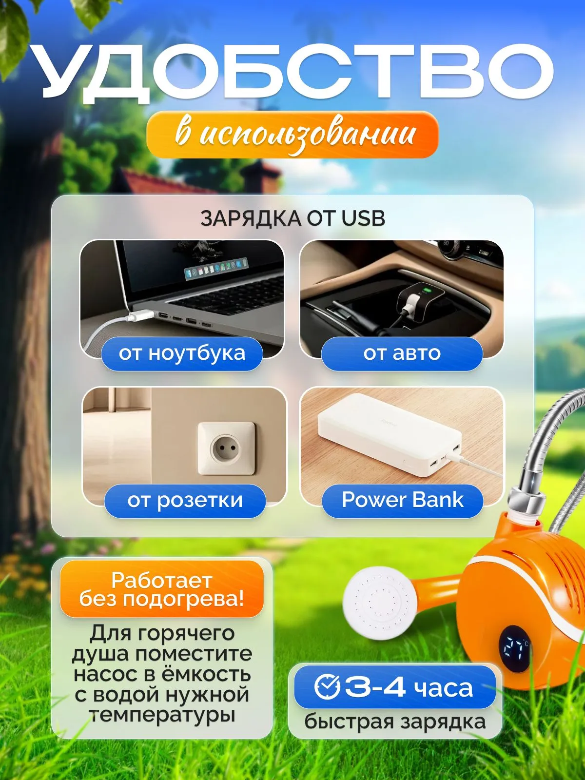 *Кемпінг і походи *Риболовля та полювання *Поливання городу та саду * Миття хатніх тварин (вихованців)