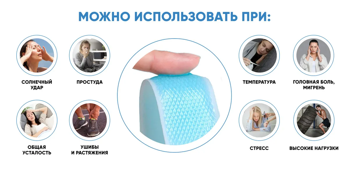 Цей гелевий лейкопластир допомагає у разі різних станів, як-от стрес, загальна втома, удари та розтягнення, а також для лікування застуди. Він знімає запалення, болі та спазми.